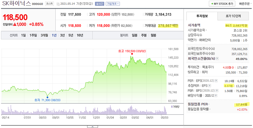 현재가 11,8500원을 기록하고 있습니다. 시가총액은 86조원으로 코스피 2위의 기업입니다. 추정 PER은 8.97배로 동일업종 17.84배에 비해서 저평가받고 있습니다.