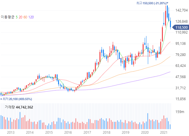 월봉차트는 기업의 거시적인 흐름을 파악할 때 유용한 차트입니다. 위는 지난 10년간 SK하이닉스의 주가를 볼 수 있습니다. 반도체 사이클에 따라서 영업이익이 감소 및 증가하면서 주가도 상승과 하락을 이어왔습니다. 그러던 작년부터 4차 산업혁명이 수요를 폭증시키면서 새로운 사이클을 타기 시작했습니다. 작년 최저가 6만 원대에서 2배 이상 상승하여 15만 원까지 상승하였습니다. 거시적인 흐름을 보면 한번 상승 사이클을 타기 시작하면 최소 2년 이상은 계속해서 상승하는 것을 알 수 있습니다. 지금 단기적으로 하락하는 것이 오히려 매수 찬스일 수 있는 것이죠.