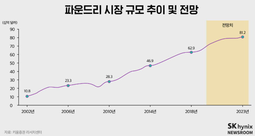 파운드리 산업의 시장규모는 2002년 108억 달러에서 2018년 629억 달러로 급증했습니다. 2023년에는 812달러 까지 성장할 전망입니다. 메모리 반도체 부분은 제품 가격이 주기적으로 변하면서 몇 년을 주기로 사이클을 타게 됩니다. 따라서 매출액의 변동성이 주기에 따라서 매우 큽니다. 반면 비메모리 반도체는 주문-생산방식이기 때문에 매우 안정적인 매출 성장세를 지속할 수 있습니다.