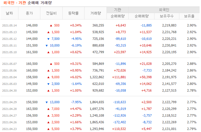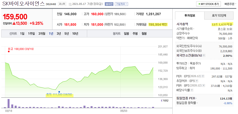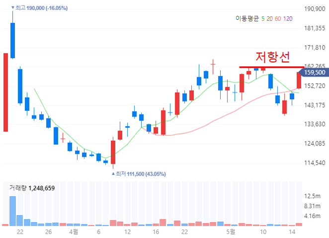 05/17일 거래대금 2천억 원을 기록하면서 9.25% 상승하여 159,500원에 마감하였습니다. 시가총액은 12조 원으로 코스피 31위의 기업입니다.