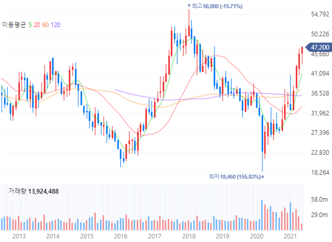 월봉차트는 기업의 거시적인 흐름을 볼 때 유용한 차트입니다. 위는 지난 10년간 하나금융지주의 주가 흐름을 보여주고 있습니다. 5-120일선까지 모두 우상향하고 있어서 장기적으로 상승추세임을 알 수 있습니다. 월봉으로 4개월 연속으로 양봉이 나오고 있는 상태입니다. 최근 상승하면서 거래량이 다소 감소하고 있는 것이 조금 아쉽네요.