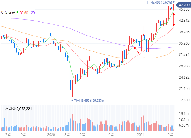주봉은 주가의 중장기적인 상황을 볼 때 좋은 차트입니다. 60일선과 120일 선이 골든크로스를 앞두고 있어서 머지않아 이평선이 정배열될 것으로 보입니다. 다만 현재 이평 선중에서 기준점이 되는 20일선과의 이격이 너무 커져서 조정일 올 확률이 높아졌습니다.
