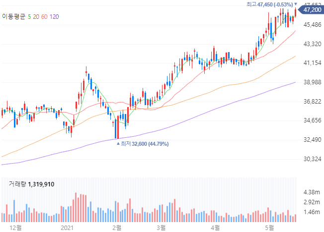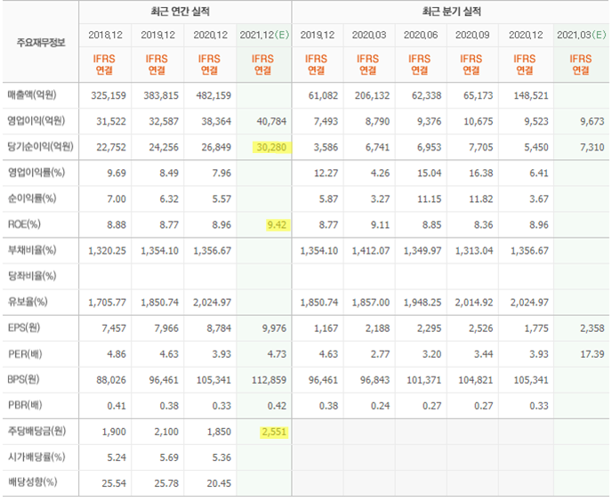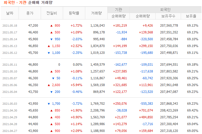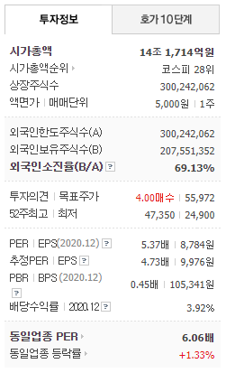 시가총액 14조 원으로 코스피 28위의 기업입니다. 추정 PER은 4.73배로 동일업종 PER에 6.06배에 비해서 저평가받고 있습니다. 기관이 최근에 매수를 하면서 주가를 상승시키고 있습니다. 05/06일에는 30만 주 이상 매수하면서 6% 가까이 주가가 상승하였습니다. 외국인은 보합세로 69.13%의 보유율을 기록하고 있습니다.