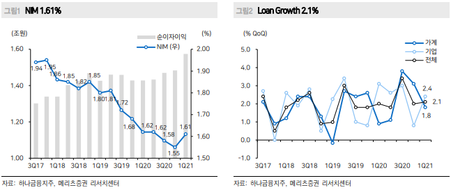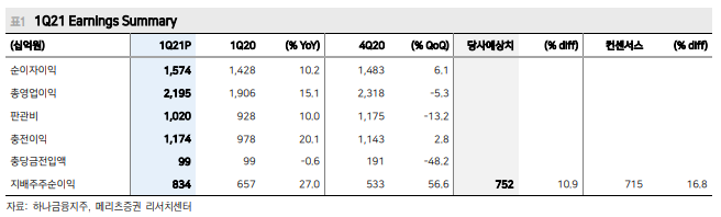 하나금융그룹의 1분기 순이익은 8344억 원으로 시장 컨센서스를 대폭 상회하였습니다. 이는 전년 동기에 비해서 27% 상승한 수치입니다. 또한 이번 분기에 일회성 비용인 비화폐성 외화환손 820억 원과 비경상 판관비 900억 원이 발생한 점을 고려하면 역대급 실적이라고 볼 수 있습니다.