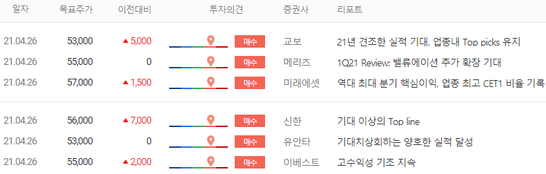 증권사 최고 목표주가는 57,000원으로 현재 가격 대비 20% 상승여력이 있습니다. 은행업종 중에서 가장 좋은 재무안정성을 가지고 있으면서 수익성도 하반기로 갈수록 극대화되고 있습니다. 또한 미국에서 인플레이션에 대한 압박으로 금리인상에 대한 목소리가 점점 커지고 있습니다. 금리인상 시 가장 큰 수혜주로 뽑히고 있는 은행주의 최선호주로써 강력하게 추천드립니다.