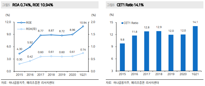 수익성 개선 외에도 CET1 비율이 14.1%로 국내 은행 중 가장 높은 비율로 상승하였습니다. CET1이란 보통주자본(Common Equity Tier 1)의 약자로 보통주, 자본잉여금, 이익잉여금, 기타 포괄손익누계액 등으로 구분될 수 있습니다. 보통의 제조업 기업들이 자본금과 부채액을 비교하여 부채비율을 측정하는 것과 다르게 은행주들의 경우는 위의 CET1을 통해서 재무 안전성을 판단합니다. 외환은행 인수에 따른 레버리지 확대로 2015년까지만 해도 CET1 비율이 9%대에 불과하여 국내은행 평균에도 미치치 못하였습니다. 이러한 재무적인 불안전성이 주가를 오랫동안 하락시키는 요인이 되었습니다.