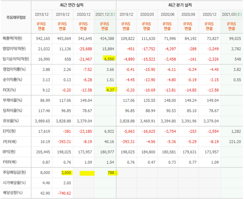 SK이노베이션의 올해 매출액 추정치는 43조원이고 영업이익은 1조 5천억 원으로 흑자로 돌아설 것으로 보입니다. 작년에는 전기차 배터리 사업 부분의 투자가 진행되었기 때문에 적자를 볼 수밖에 없었습니다. 하지만 올해부터는 본격적으로 배터리 사업부문이 실적이 나오면서 흑자로 전환되었습니다. 적자 때문에 부채비율도 150%로 늘어났지만, 올해는 조금 줄어들 것으로 보고 있습니다. 배당도 작년에는 적자 때문에 지급되지 못했지만 올해는 조금이라도 나올 것으로 기대됩니다.