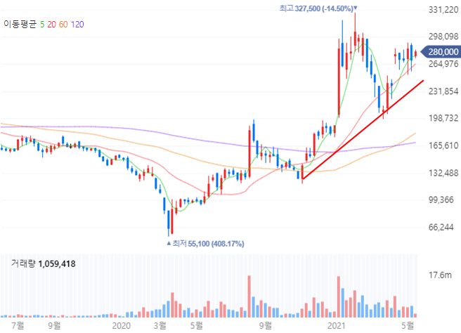 주봉차트는 주가의 중장기적인 흐름을 파악할 수 있는 차트입니다. 모든 이평선들이 정배열을 이루면서 우상향하고 있는 매우 기분 좋은 상태입니다. 현재 조정을 받고 있는데 빨간색 선인 상승 추세선을 지켜주면서 버텨준다면 또 한 번 상승할 수 있을 것으로 보입니다. 위의 추세선에 가까워지면 매수, 추세선을 못 지켜주고 하락해버린다면 매도 신호로 볼 수 있습니다.
