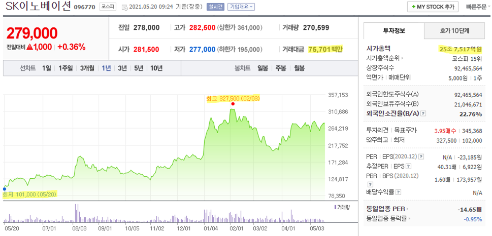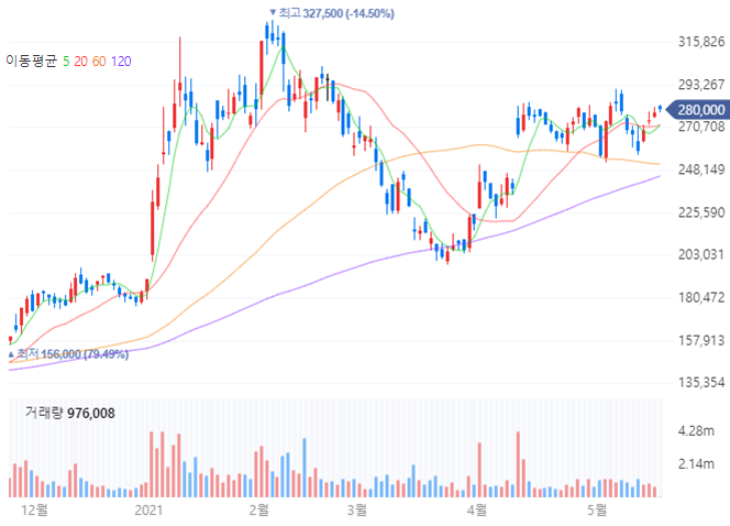 시가총액 25조원으로 코스피 15위 기업입니다. 52주 최저가는 101,000원이고 최고가는 327,000원입니다. 05/20일 장중 279,000원을 기록 중입니다.