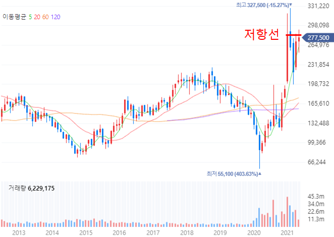 월봉차트는 기업의 거시적인 흐름을 볼 때 유용한 차트입니다. 위는 지난 10년간 SK이노베이션의 주가흐름을 보여주고 있습니다. 현재 5-120일선까지 모두 우상향하고 있어서 장기적으로 상승추세임을 알 수 있습니다. 월봉상으로 이전 고점인 28만 원이 저항선으로 보입니다. 위의 가격을 돌파하게 되면 52주 최고가인 327,000원도 다시 도전할 수 있을 것으로 보입니다.