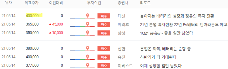 증권사 최고목표주가는 40만 원으로 현재 가격 대비해서 35% 이상 상승여력이 있습니다. 2025년까지 계획된 배터리 공장을 증설하면 규모의 경제를 달성하게 되고 그 결과 수익성이 대폭 향상될 것으로 보고 있습니다. 또한 핵심소재인 '양극재'도 직접적으로 생산하면서 원자재에 대한 자급력을 확보하게 되었습니다. 포드와 폭스바겐 등의 굵직한 완성차업체를 매출처로 두고 있어서 금상첨화의 상태입니다. 단기적으로 주가가 조정을 받을 때 매수하셔서 장투 하는 방법을 추천드립니다.