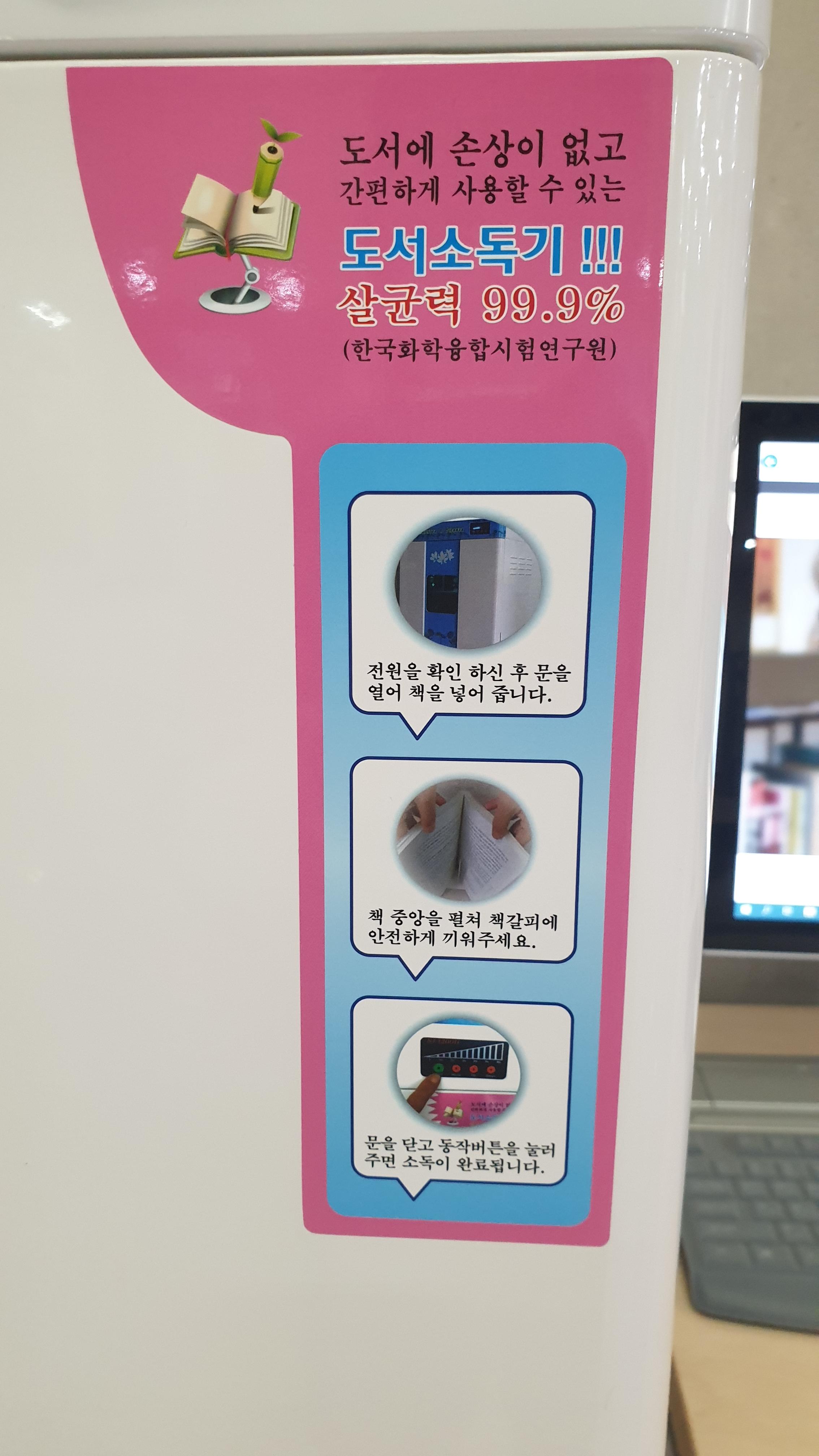 용인중앙도서관에서 책을 빌리다가 아래와 같은 도서 살균기를 보게 되었습니다. 항상 책을 읽으면서 세균이 묻어있을 것이라고 생각되서어서 찜찜했었습니다. 도서 살균기를 통해서 깨끗한 책을 읽을 수 있을 것 같습니다.