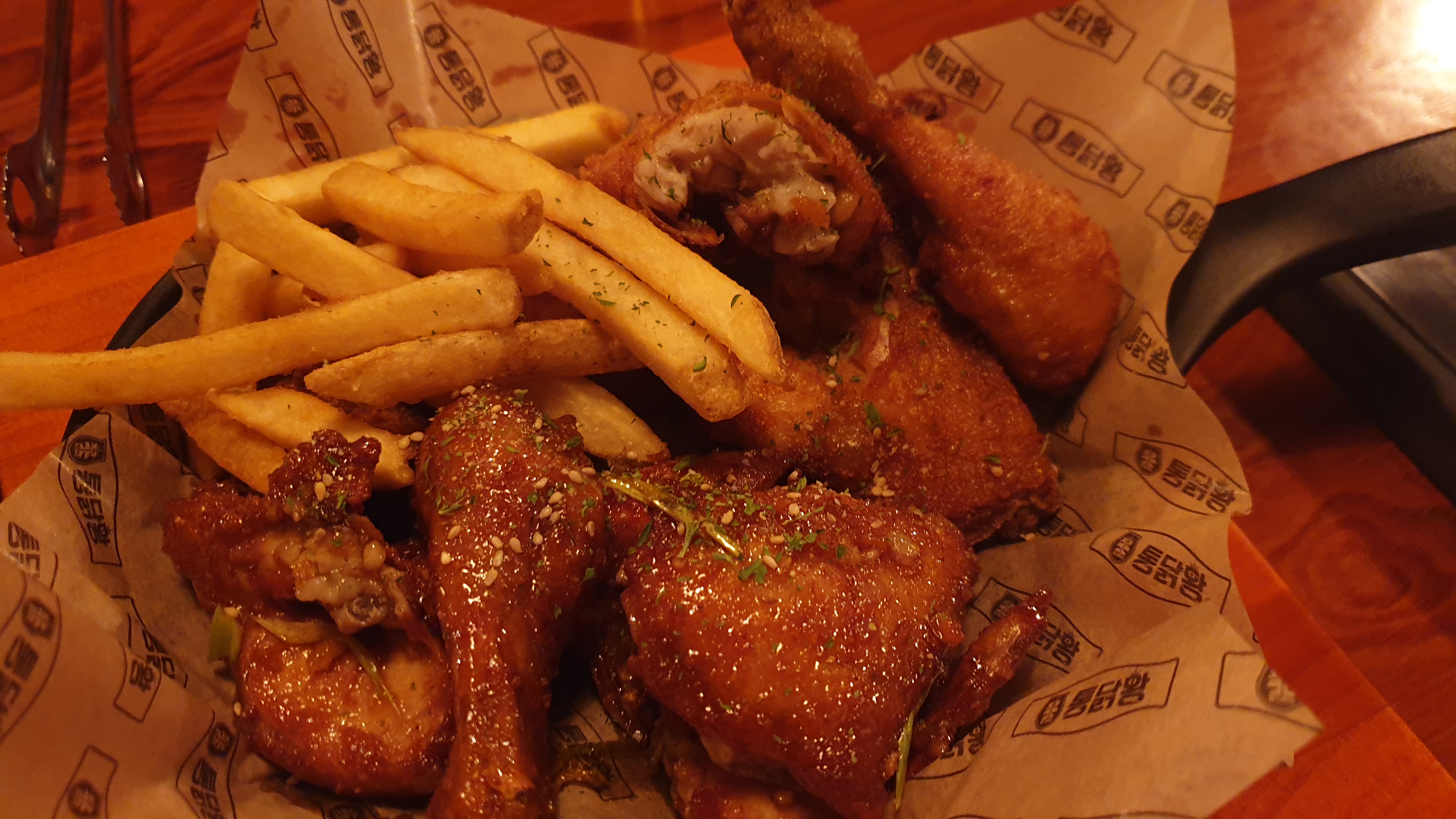 간장과 후라이드 반반 메뉴를 주문하였습니다. 가격은 15,900원이에요. 감자튀김도 있어서 양은 적당하였습니다. 기본으로 3가지 소스를 추가로 줍니다. 통닭이 프라이드 치킨보다는 심심할 수 있는데 소스가 많아서 다채로운 맛을 즐길 수 있었어요.