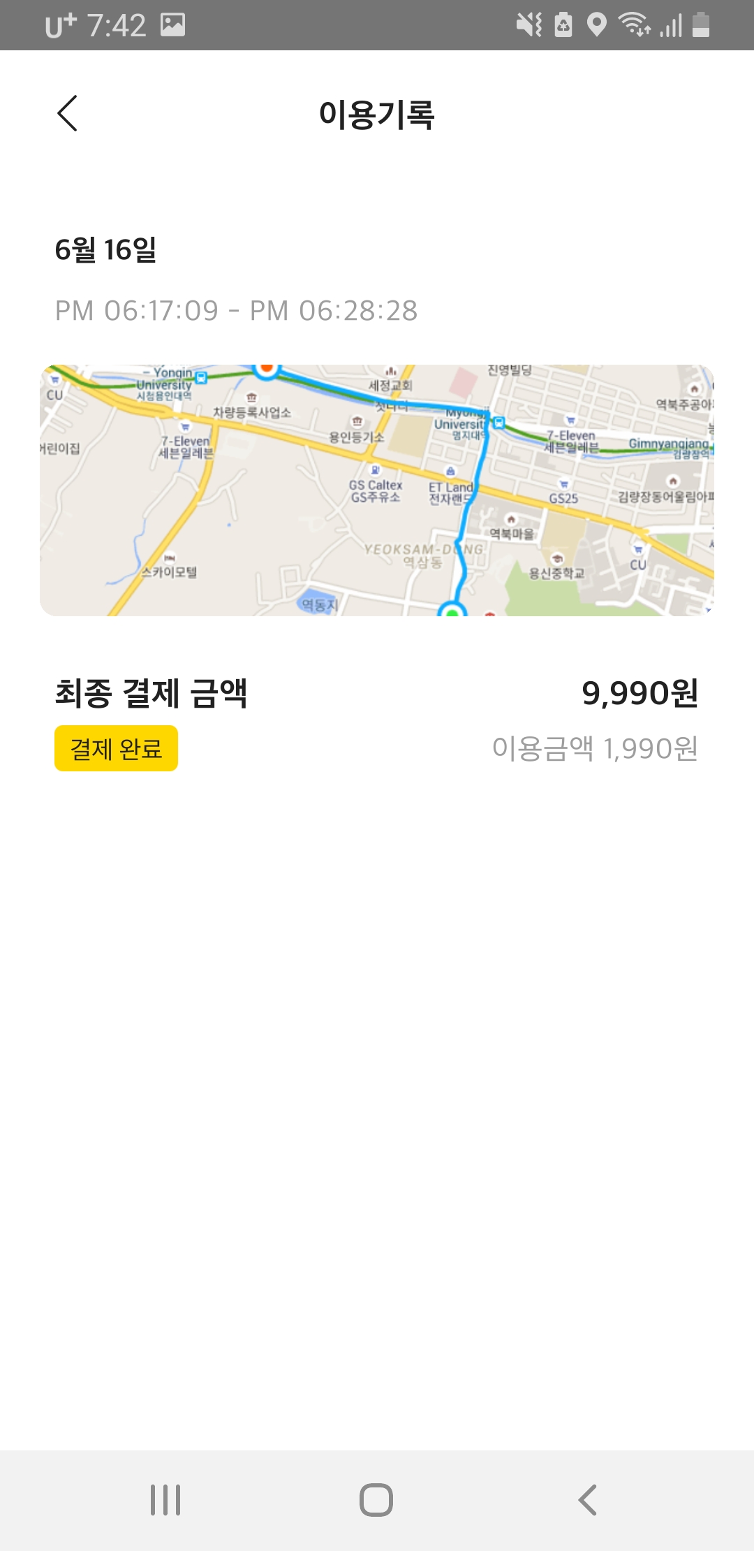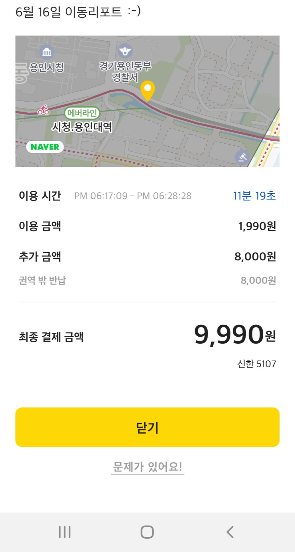 이용시간은 11분 19초가 나왔습니다. 하지만 사용가능한 권역 밖으로 나가버리는 바람에 추가 요금이 발생하였습니다. 저는 용인시에서 아무 곳이나 반납하면 되는 줄 알았는데 그게 아녔습니다. 혹시라도 사용하시려는 분들은 꼭 주의하시기 바랍니다. 배보다 배꼽이 더 큰 사태가 발생했네요. 기분 좋게 킥보드를 타서 좋았는데 끝이..... 다음부터는 꼭 이용권역을 확인해야겠네요.
