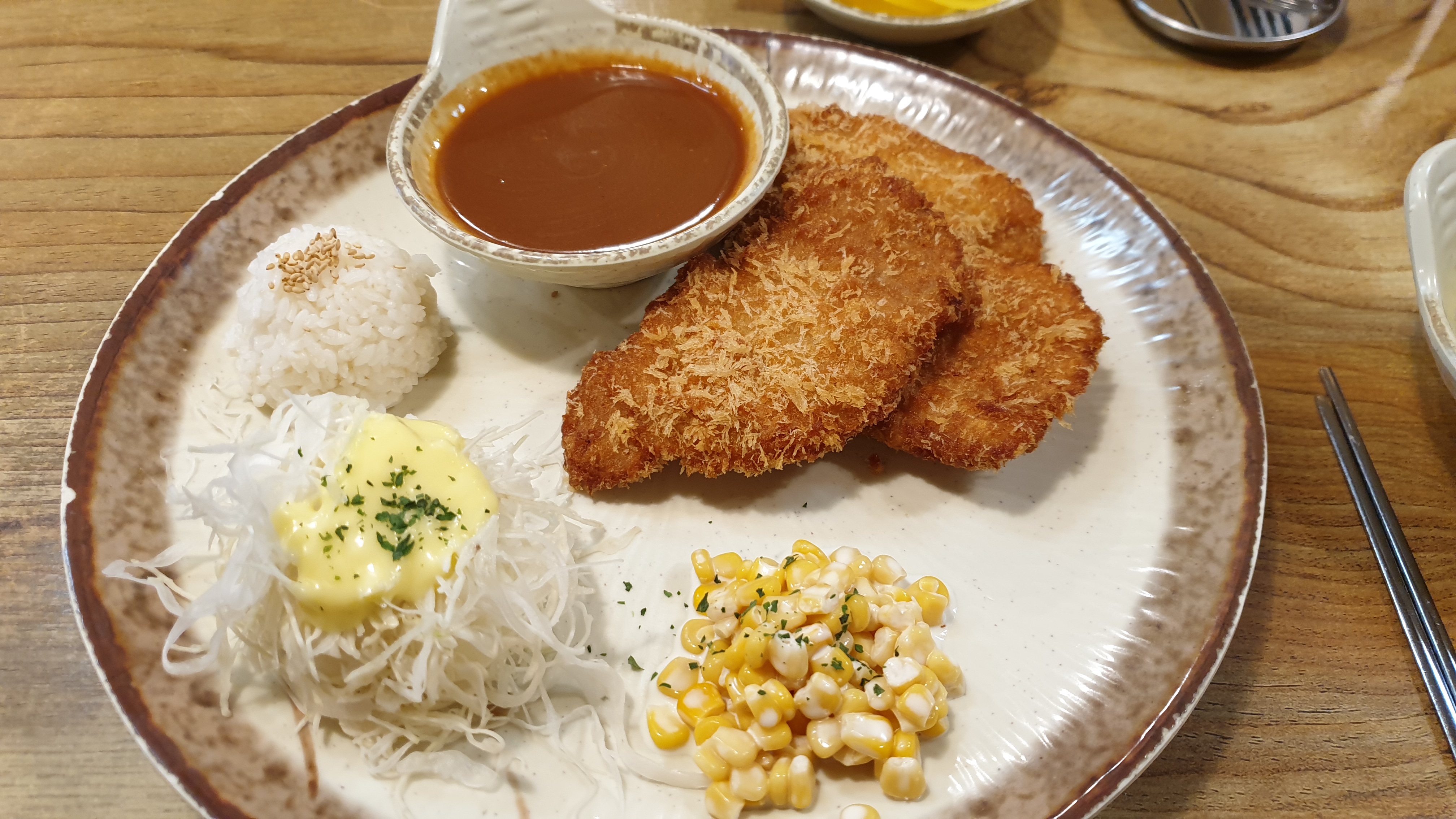 돈가스와 칡냉면을 주메뉴로 하는 곳입니다. 저는 매운 것은 못 먹어서 달콤 돈가스를 주문하였습니다. 8,000원입니다. 식전 옥수수 수프가 나왔는데 시제품으로 만들어졌네요. 맛은 그럭저럭 좋았습니다.