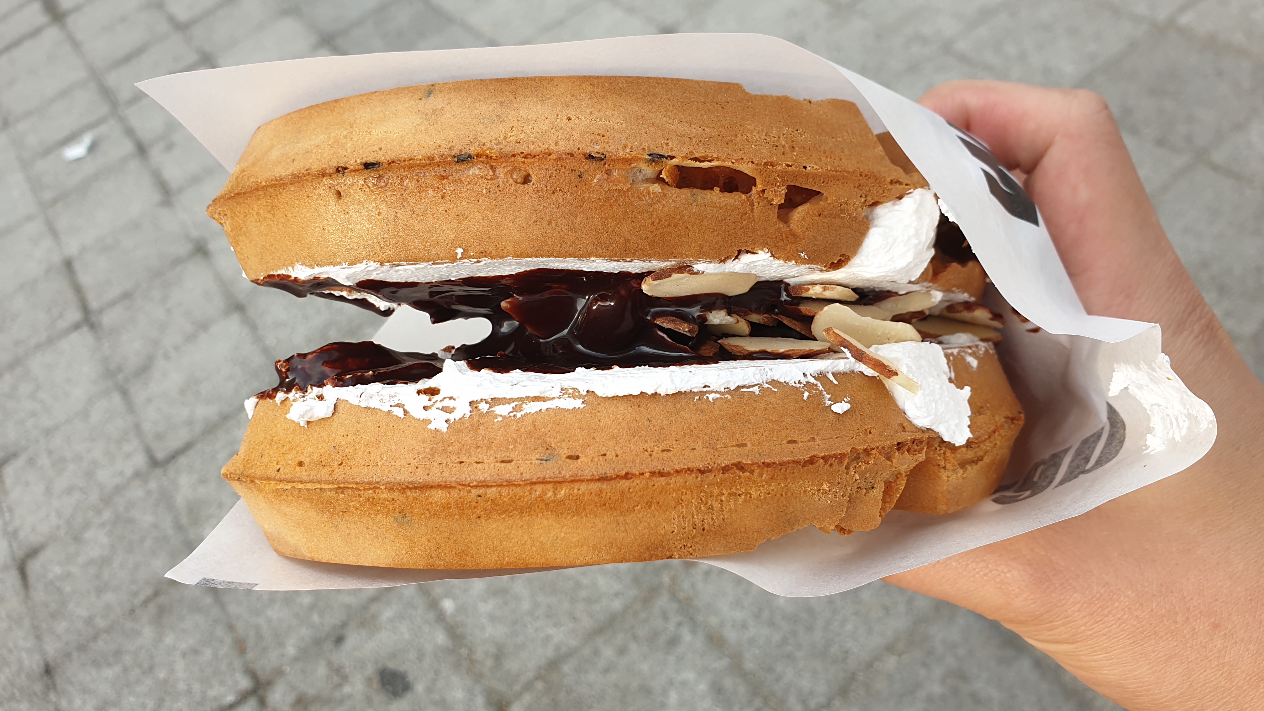 사람들이 알고 있는 일반적인 아메리칸 스타일의 와플보다 훨씬 두꺼운 크기의 와플입니다. 한입에 다 먹기에 힘들 정도로 두껍습니다. 한쪽이 3cm라고 하네요. 저는 초코아몬드를 먹었습니다. 빵은 굉장히 바삭바삭하였고 생크림은 신선한 느낌이었습니다. 초코시럽은 달달하고 좋았어요. 간식으로 먹으려고 했는데 양이 많아서 식사로도 충분한 양이었습니다.