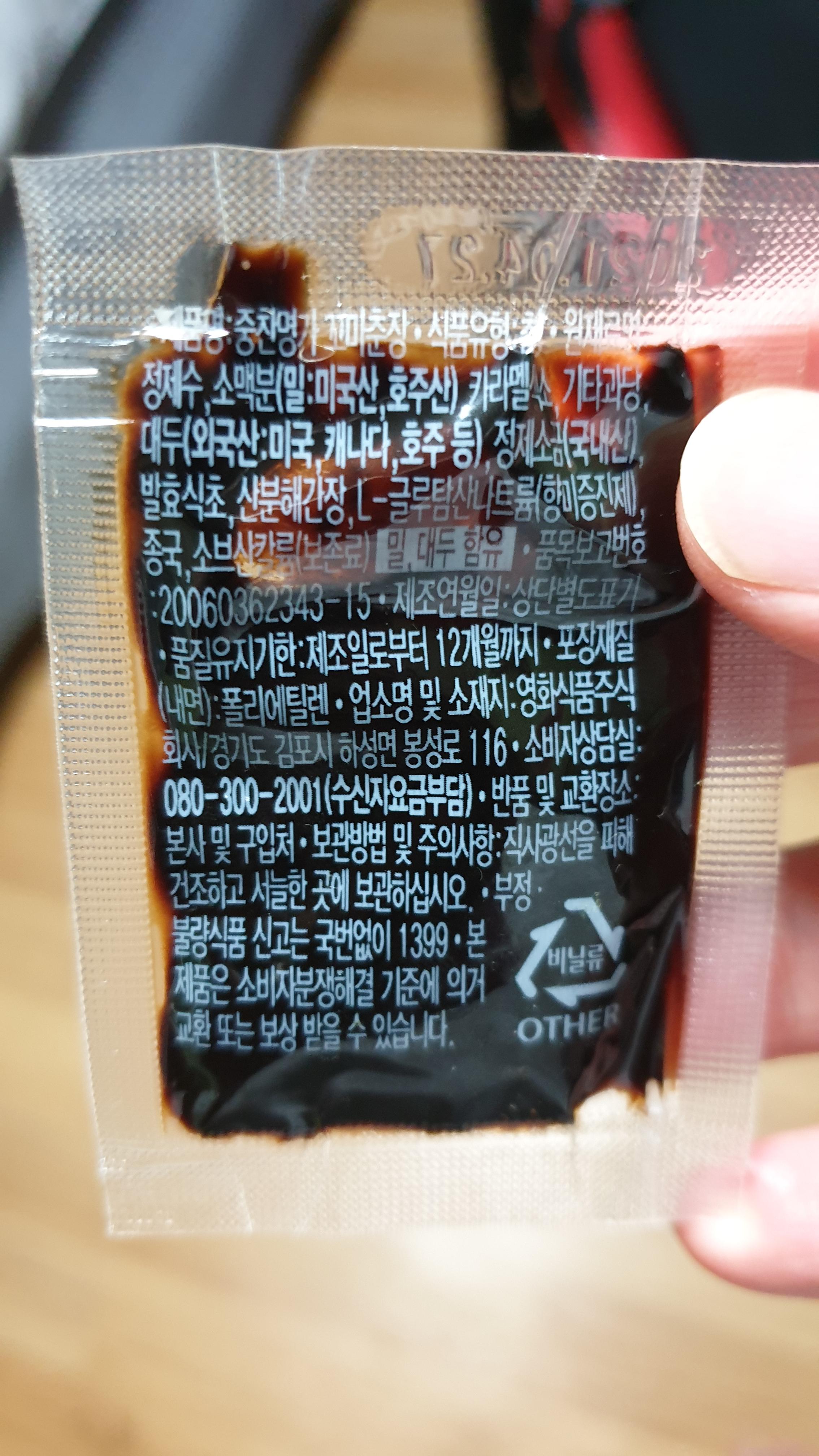 정제수, 소맥분, 카라멜색소, 기타 과당, 대두, 정제소금, 발효식초, 산분해 간장, L-글루탐산나트륨, 종국, 소브산칼륨 등이 들어갔습니다.