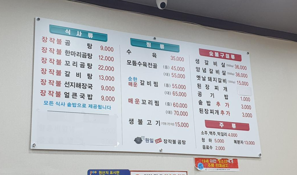 곰탕과 갈비탕이 주요 메뉴입니다. 일반 곰탕 9,000원이고 한마리곰탕은 도가니라고 하더군요. 저희는 곰탕 2개에 갈비탕 1개를 주문하였습니다. 숯불구이로 생갈비살과 옛날 돼지갈비도 판매하고 있었습니다. 갈빗살은 미국산입니다.