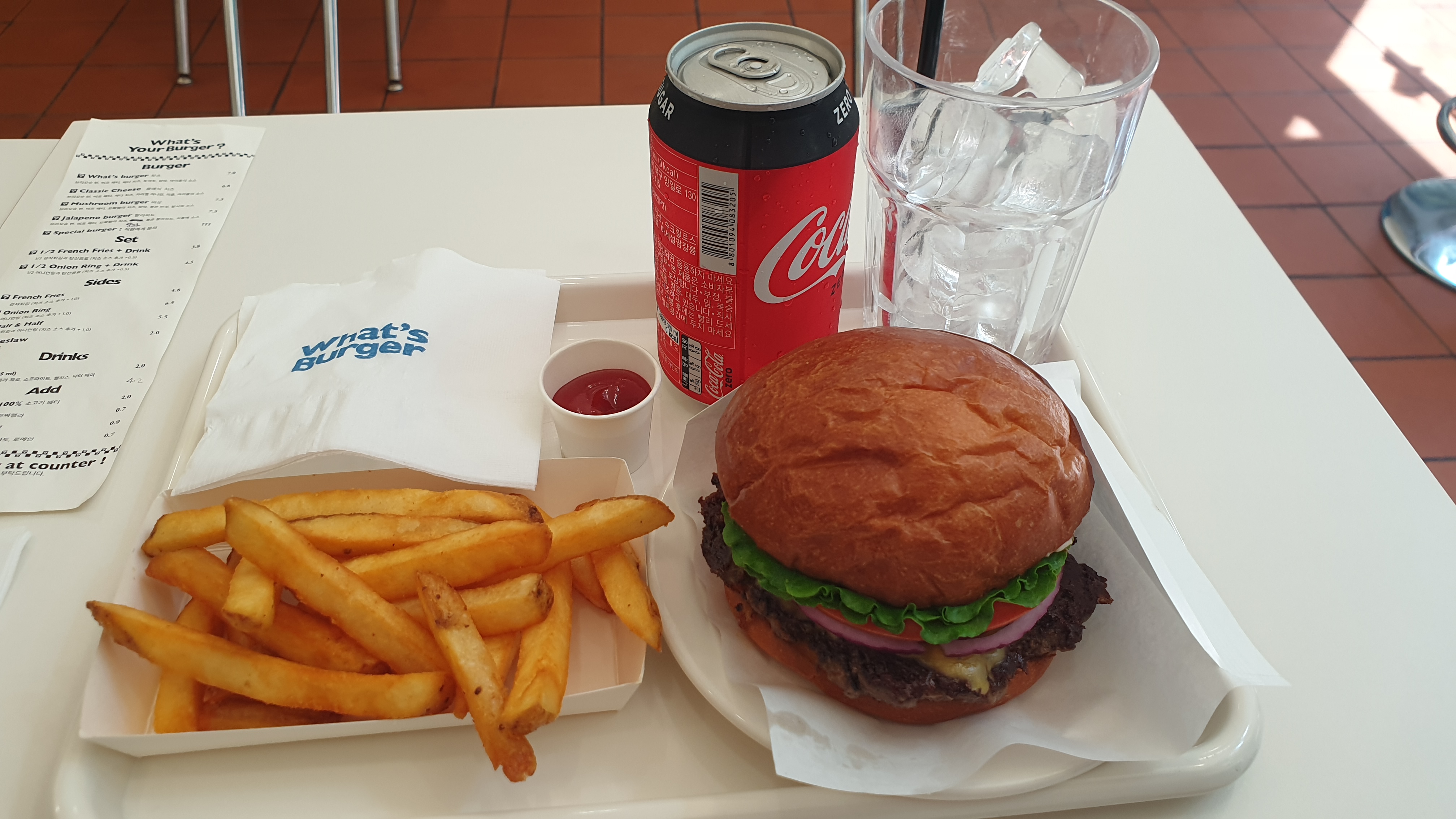 버거와 감자튀김 그리고 콜라입니다. 왓츠 버거는 신기한 게 양파가 생으로 들어간다는 것입니다. 보통은 볶은 양파를 얹어주는 것으로 알고 있는데 신기하였습니다. 느끼함 없이 밸런스가 좋은 버거였습니다. 고기도 육즙과 풍미가 좋은 편이었습니다. 감자튀김은 평범하였습니다. 직원들도 친절하고 좋았습니다.