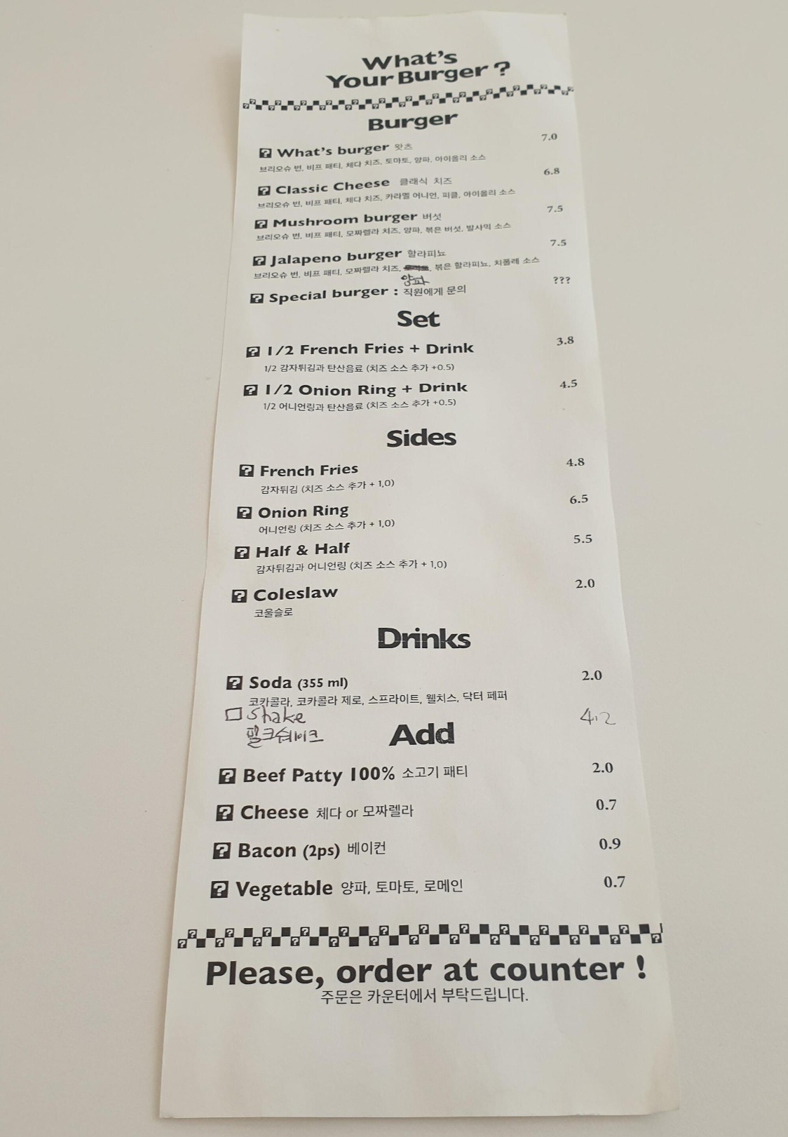 따로 메뉴판은 없고 이렇게 영수증같이 생긴 것이 메뉴판입니다. 버거는 대부분 7,000원 정도이고 세트까지 추가하면 만원 정도에 한 끼를 드실 수 있습니다. 저는 왓츠 버거에 1/2 감자튀김 세트를 주문하였습니다.