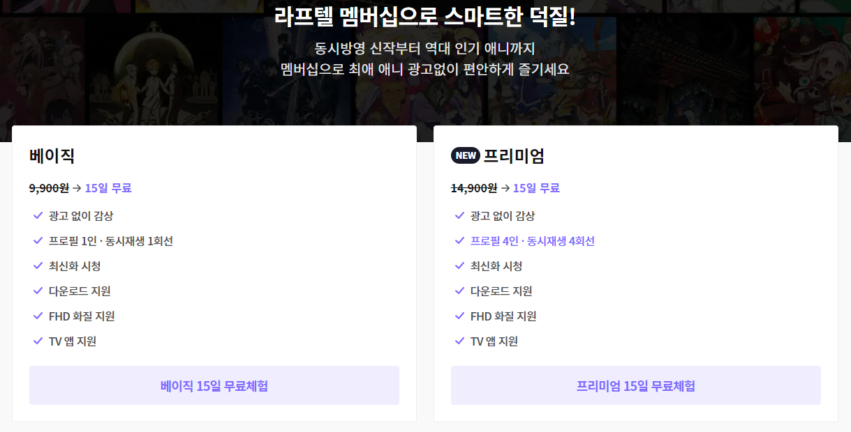 요금제는 베이직과 프리미엄으로 나뉘며 처음 구독시에서는 15일간 무료체험을 할 수 있습니다. 베이식의 경우 월요금 9,900원이고 동시접속 가능인원이 1명입니다. 이에 반해 프리미엄은 14,900원으로 4인이 동시에 접속할 수 있습니다. 최신화 시청, 다운로드, 화질의 차이는 없습니다.