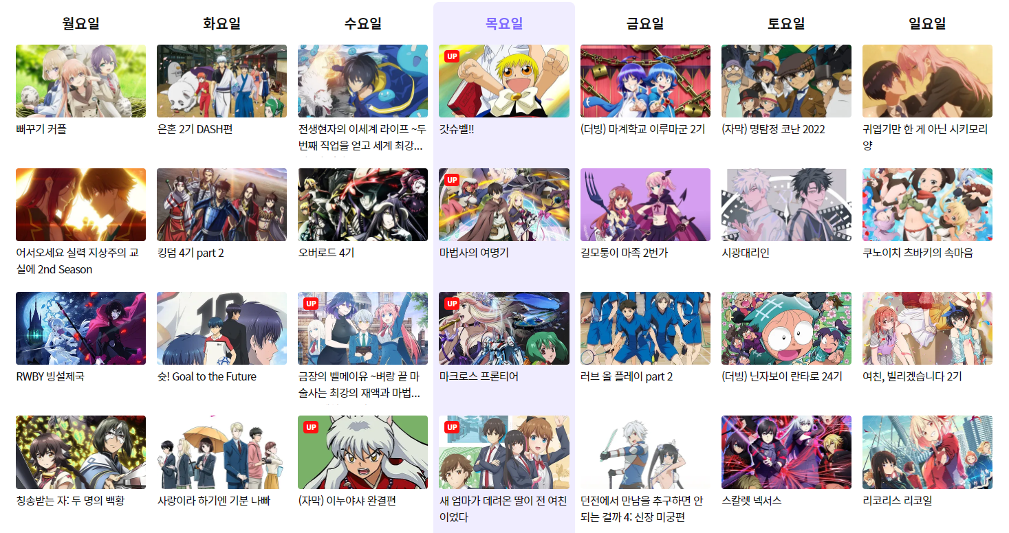 처음 가입시 애니메이션 평가를 통해서 사용자의 취향에 맞는 애니메이션을 추천해줍니다. 또한 요일별로 최신화 업데이트를 확인할 수 있으며 태그별, 장르별, 분기별로 분류하여 애니를 찾아볼 수 있습니다.