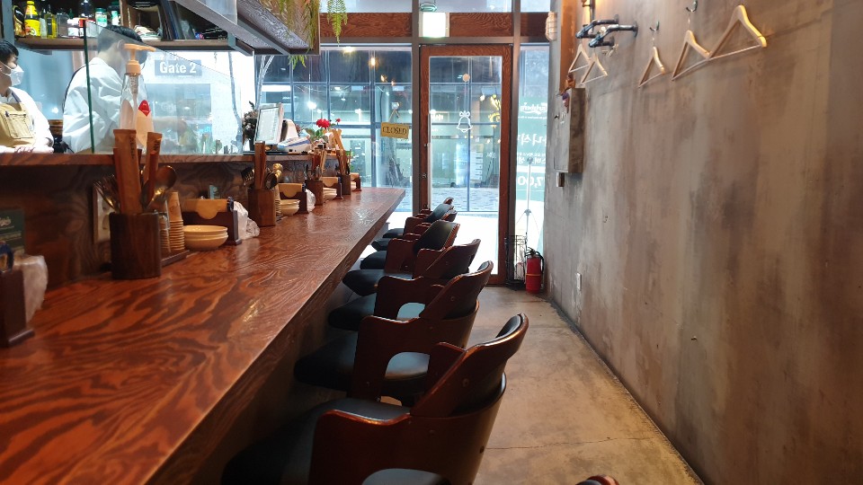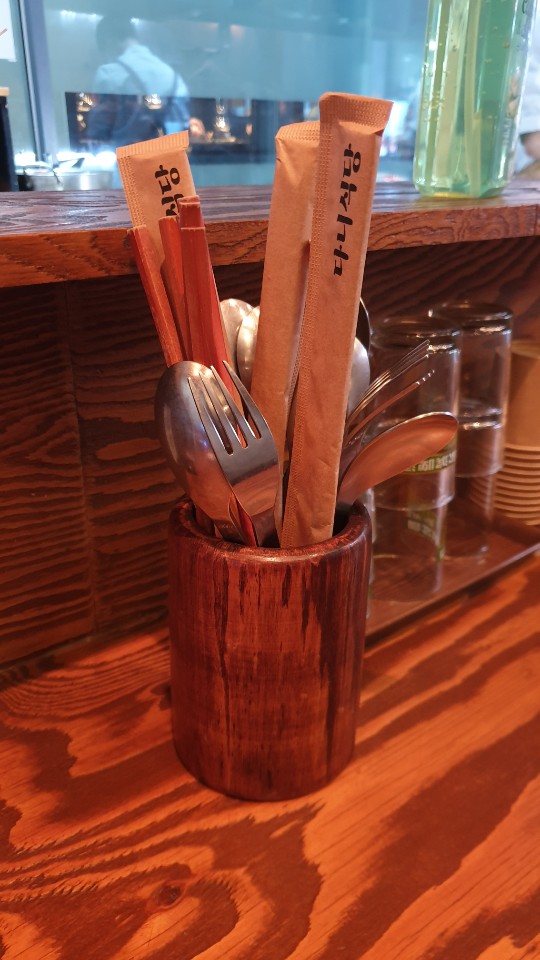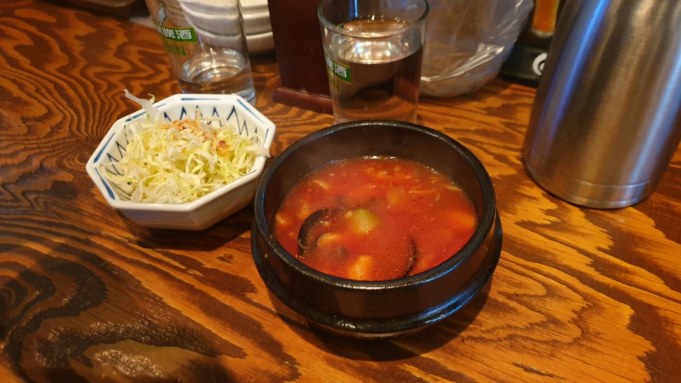 메뉴를 기다리는 동안 내부 전경을 찍어보았습니다. 전체적으로 바로 구성되어있어서 오픈키친을 볼 수 있었습니다. 수저와 포크는 깔끔하게 정돈되었어요. 혹시 불안한분들을 위해서 나무젓가락도 준비해두었네요. 양배추 샐러드와 토마토 홍합 스튜를 준비해주셨습니다. 칼칼하면서 토마토 신맛이 나서 입맛을 돋구기에 정말 좋았습니다.