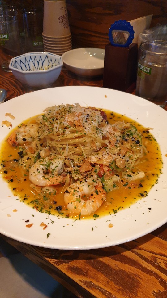 새우가 들어간 알리오 올리오 입니다. 일단 새우가 굉장히 탱글탱글합니다. 면은 대중적인 스파게티보다 조금 앏은 면을 사용했네요. 애호박디 들어있어서 호불호가 조금 갈릴 수 있다고 봅니다. 가장 놀라웠던 점은 알리오 올리오 답게? 정말 마늘이 많았다는 점이에요. 그것도 일정하게 썰은 것이 아닌 뭉게서 터프한 형태의 마늘을 사용했습니다.