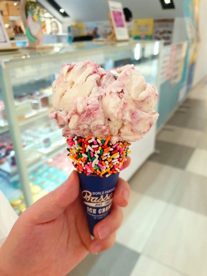 옷을 고르고 나오는데 아기자기하게 생긴 아이스크림 가게가 눈에 보였다. 참새가 방앗간을 지나칠 수 없듯이, 아이스크림 가게에 들렀다. 수제 아이스크림이고 미국에서 가장 오래된 브랜드라고 한다. 가격대랑 맛을 선택하는 방법이 베스킨31과 흡사하다. 콘으로 주문을 하였다.