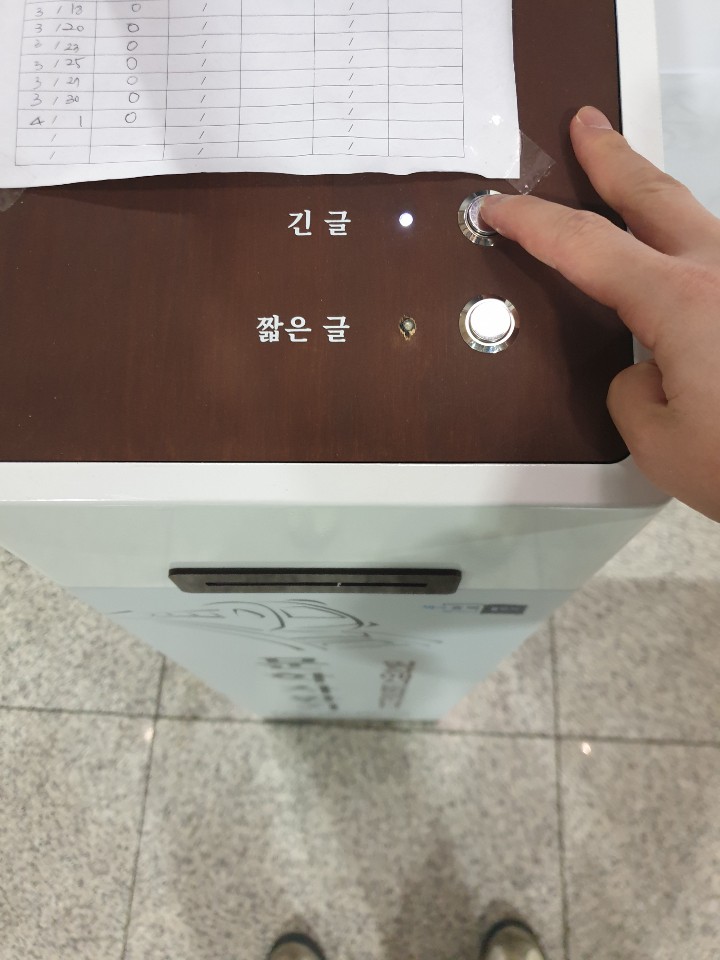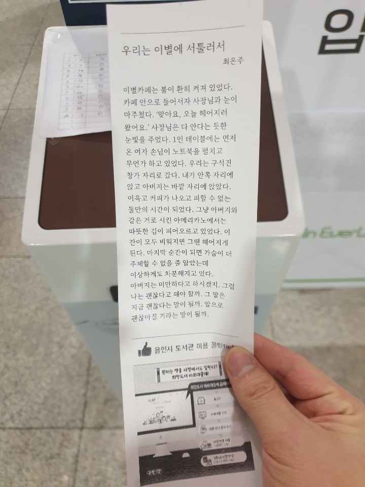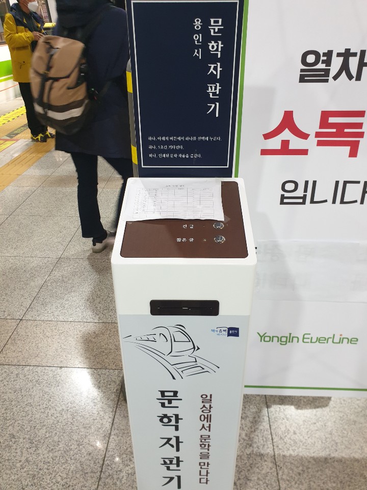분당선 기흥역에서 에버라인 기흥역까지 긴 에스컬레이터를 타고 올라오면 투표함처럼 생긴 작은 상자가 보인다. 자세히 다가가서 보면 이렇게 적혀있다. 용인시 문학자판기라고 말이다. 어이쿠, 내가 이런 문학적인 도시에 살고 있었나?하면서 놀라게 된다. 그리고 무언가에 이끌리듯이 조심스럽게 다가갔다. 아래에는 이러한 문구가 적혀있다.