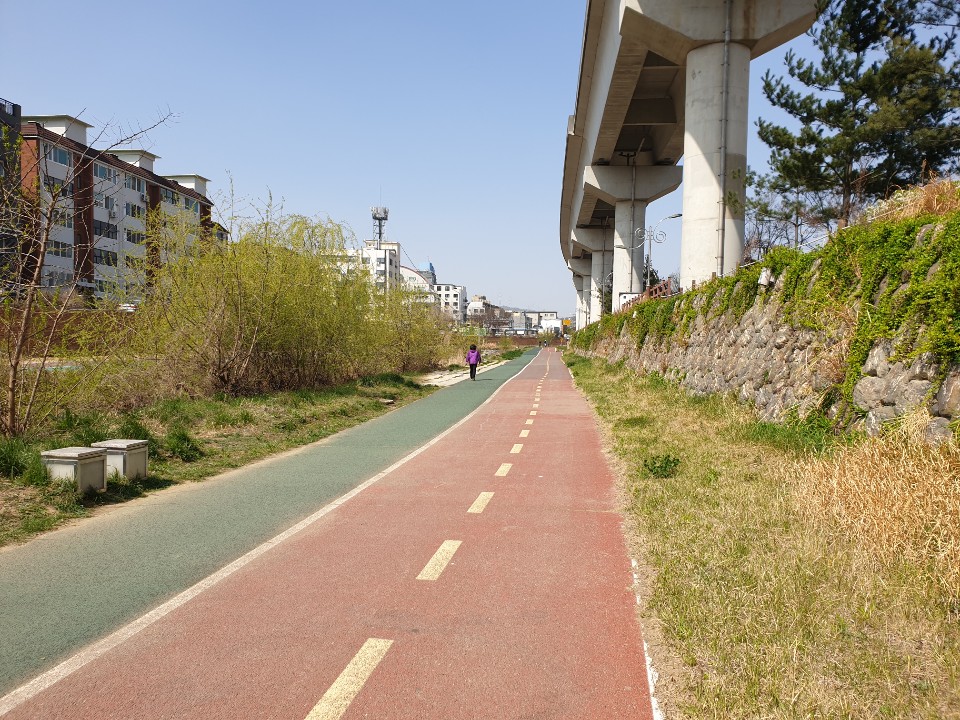 날씨가 정말 좋아서 시야가 확 트여있어서 경치를 구경하기에 좋았습니다. 산책을 위해서 걷는 분들도 여럿 계셨습니다. 겨울에 색을 잃었던 풀과 나무들이 다시 생명력으로 치장한 모습이 저를 기쁘게 했습니다. 패달을 밟을 때는 힘이 들었지만 마음은 점점 가벼워졌습니다. 한 주간의 피로가 오히려 풀렸네요.