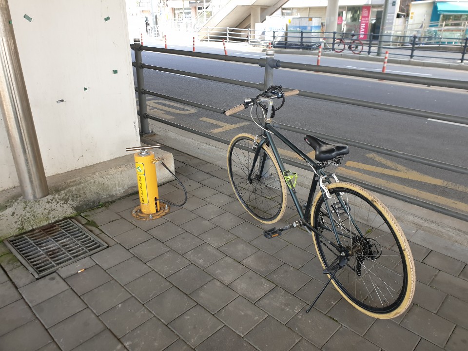 자전거 정거장? 옆쪽으로 조금만 가면 노랑색 공기주입기가 보입니다. 그 옆에 제 오래도니 자전거를 주차해놓았습니다. 일단 가까이 가서 상태를 살펴보겠습니다.