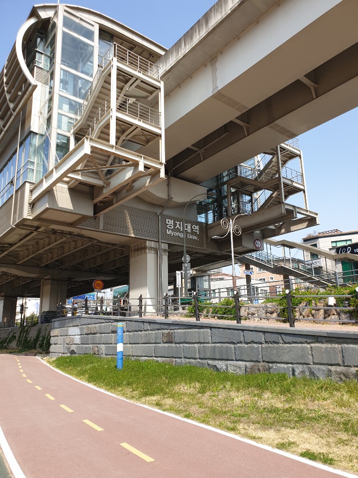 에버라인의 중간쯤 위치한 명지대역입니다. 자전거도로 쪽에서 찍은 모습인데 햇살이 밝아서 잘 나왔네요. 일단 위쪽으로 올라가서 자전거 보관소에 가야합니다. 공기가 빠진 자전거랑 같이 올라가느라 조금 힘들었습니다.