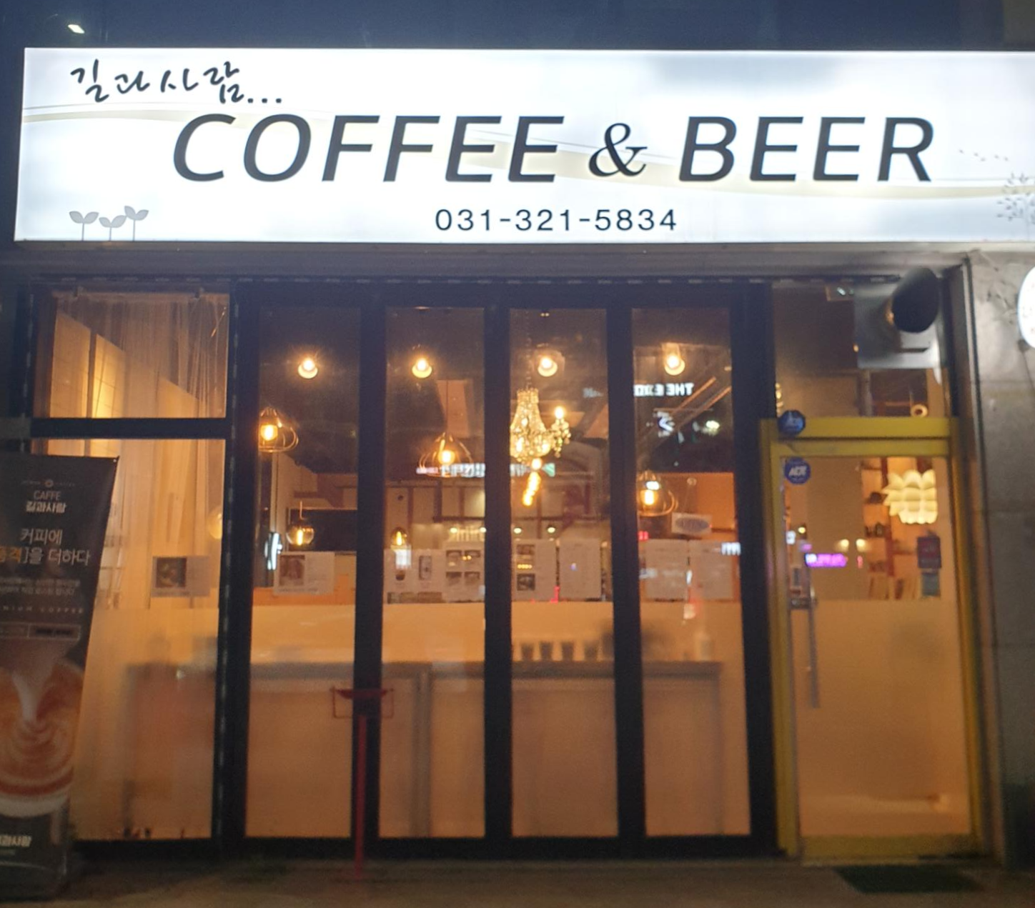 가게 전경과 간판은 이렇게 생겼습니다. 커피와 맥주라는 타이틀을 내세우고 있네요. 예전에는 보라색 조명을 써서 약간 음침한 술집 느낌이 났는데 주황색 조명을 써서 아늑한 느낌이 드네요. 얼른 들어가 보겠습니다.