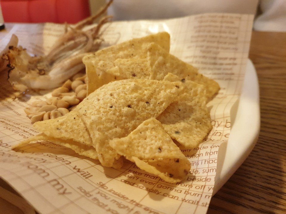 알맞게 구워나온 반건조 오징어와 양념 땅콩 그리고 나쵸가 나왔습니다. 오징어는 뜯어먹기 좋게 칼집을 내주셨네요. 소스로는 고추장, 마요네즈, 청양고추와 간장과 마요네즈가 섞인 세 가지 종류가 나왔습니다. 12000원의 구성으로 보면 썩 나쁘지는 않다고 봅니다. 그럼 중요한 것은 맛이 될 텐데요. 하나씩 먹어보면서 설명해드리겠습니다.