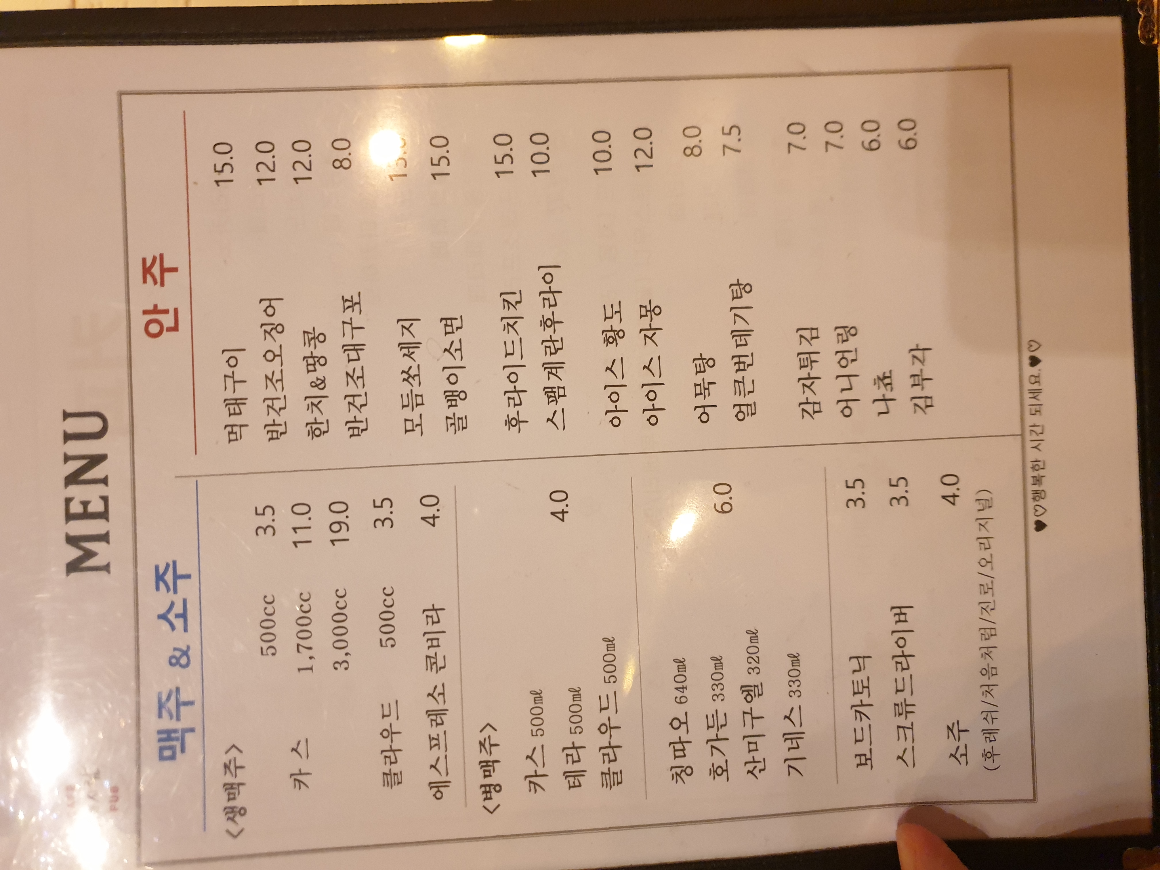 안주류는 크게 마른안주, 과일류, 튀김류, 탕류로 나뉘는 것 같아요. 대부분 냉동이나 건조식품으로 유통기한을 관리하기 편한 식재료로 구성되어 있습니다. 장사하는 입장에서는 굉장히 실용적으로 메뉴를 구성해놓았습니다만, 손님입장에서는 이 집만의 특별한 메뉴는 없어서 조금 아쉽네요. 전체적으로 가격대는 싸지도 않고 비싸지도 않은 중간 정도라고 생각합니다.
