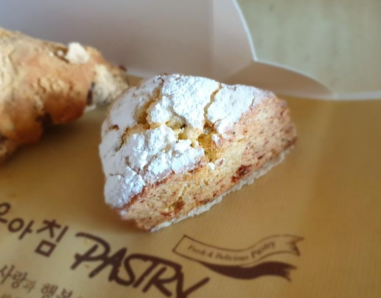빵에다가 눈을 뿌려놓은 것 같네요. 사실 저는 스콘을 먹으면 목이 메여서 별로 좋아하지는 않습니다. 하지만 누나가 커피 마니아인데 같이 먹으면 맛탱이라고 항상 말하더라고요. 치즈가 위에 뿌려져 있어서 빵에 풍미를 더해줍니다.