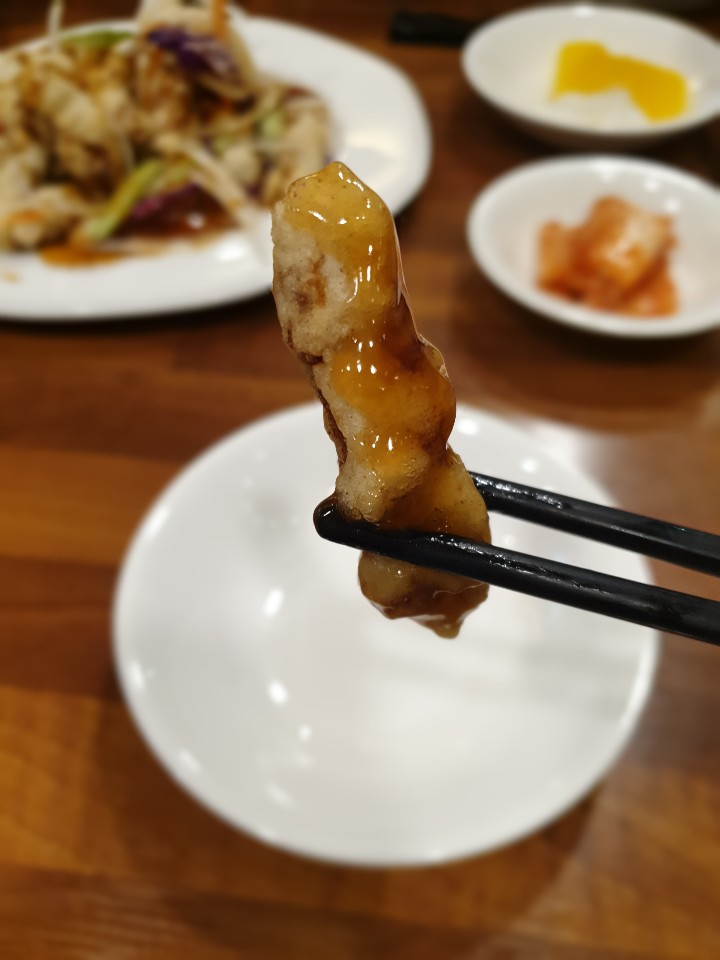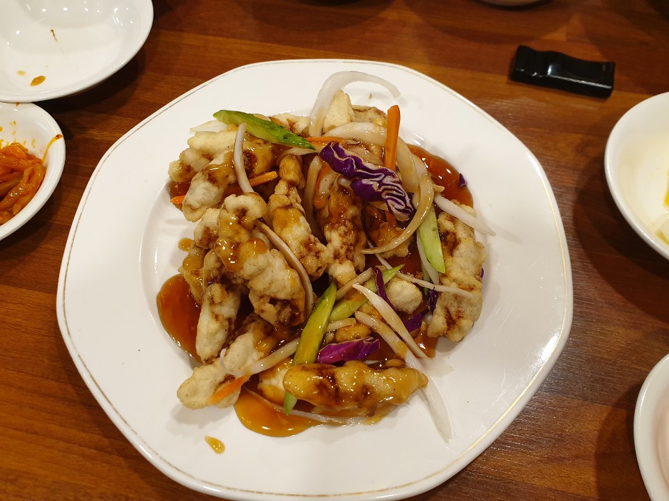 오늘의 주인공 탕수육이 나왔습니다. 찍먹과 부먹으로 인간관계에 분단현상이 나타나지 않도록 시원하게 소스를 끼얹어주셨네요. 간장베이스의 소스로 특별한 점은 느끼지 못했습니다. 소스를 조금 듬뿍 뿌려줬으면 좋겠네요. 밑에 있는 소스를 꾸역꾸역 발라서 먹었습니다.