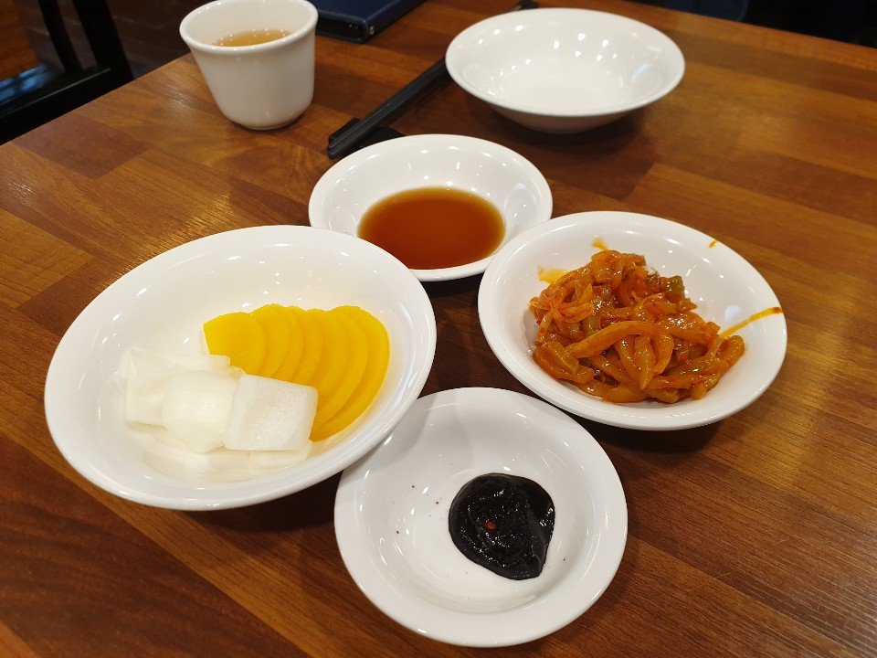 단무지와 양파, 간장과 쨔샤이가 준비됩니다. 또한 따뜻한 차를 물대신 주네요. 쌀쌀한 바람에 추워진 몸을 녹일 수 있었습니다. 간장을 주는게 특별했는데 처음에는 어디에 찍어먹으라고 주는 건지 잘 몰랐습니다. 하지만 탕수육이 나오고 찍어 먹으니 맛이 있더군요.
