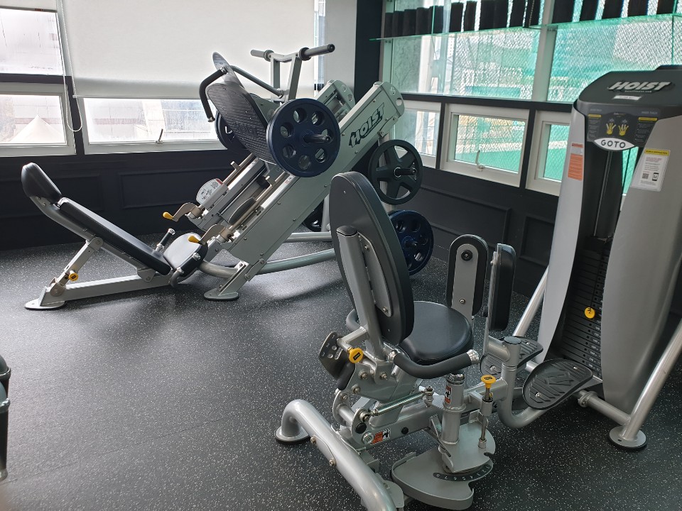 근육운동실은 크게 머신,프리웨이트,스트레칭 및 pt회원전용 공간으로 나뉩니다. 일단 머신은 hoist하는 제품을 사용하고 있습니다. 잘은 모르겠지만 미국에서 상당한 위치에 있는 제품이라고 하네요. 체스트 프레스, 숄더 프레스, 랫풀 다운등의 상체 기구부터 래그 프레스등의 하체 운동기구까지 다양한 기구들을 제공하고 있습니다.