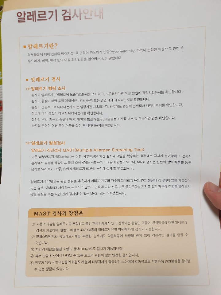 그래서 이번에는 알레르기검사를 해서 만약 양성반응이 나온다면 해당 알레르기 반응을 일으키는 요소를 차단함으로써 건강을 지켜야겠다고 마음먹었습니다. 의사선생님께 여쭤보니 알레르기 검사는 크게 두 가지로 나뉜다고 알려주셨습니다. 하나는 피부에 알레르기 물질을 긁어서 반응이 오는지를 직접적으로 판단하는 방법입니다. 두 번째는 혈액을 뽑아서 검사를 받는 방법입니다. 둘 다 장점과 단점을 가지고 있습니다. 피부에 하는 방법은 즉시 검사를 해서 바로 알 수있다는 점입니다. 하지만 알레르기 약을 이미 먹고 있다면 검사를 할 수 없습니다. 혈액에 하는 방법은 시간이 상대적으로 덜 든다는 점입니다. 하지만 단점으로는 검사결과를 알기위해서는 3~7일정도의 시간이 소요된다는 점입니다.