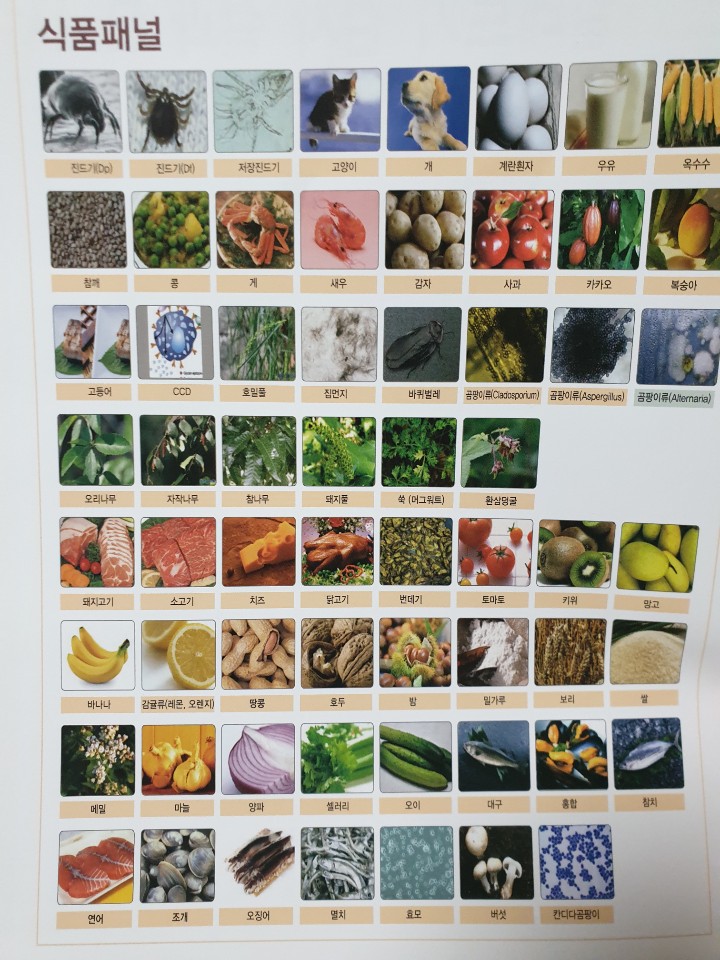 알레르기를 유발하는 물질이 나와있습니다. 대표적으로 진드기가 있는데 특이한것은 종류가 3가지나 된다는 사실입니다. 진드기에도 여러종이 있다는 사실을 새로이 깨달았습니다. 그왜 집먼지라든가 음식류들이 눈에 띄네요. 또한 곰팡이도 진드기를 일으킬 수 있나 봅니다. 확실히 보기에 않좋은 것이 몸에도 않좋은것 같습니다. 여러 맛있는 음식들이 나와있는데 제발 제가 좋아하는 조개, 소고기, 돼지고기는 양성반응이 나오지 않았으면 좋겠습니다.