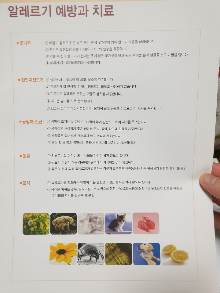 마스크, 환풍, 동물털 등을 주의하라고 명시되어있습니다. 그러나 알레르기를 일으킨다고 음식을 너무 적게 먹으면 충분한 영양분이 섭취되지 않아서 오히려 건강에 지장을 줄 수 있습니다.