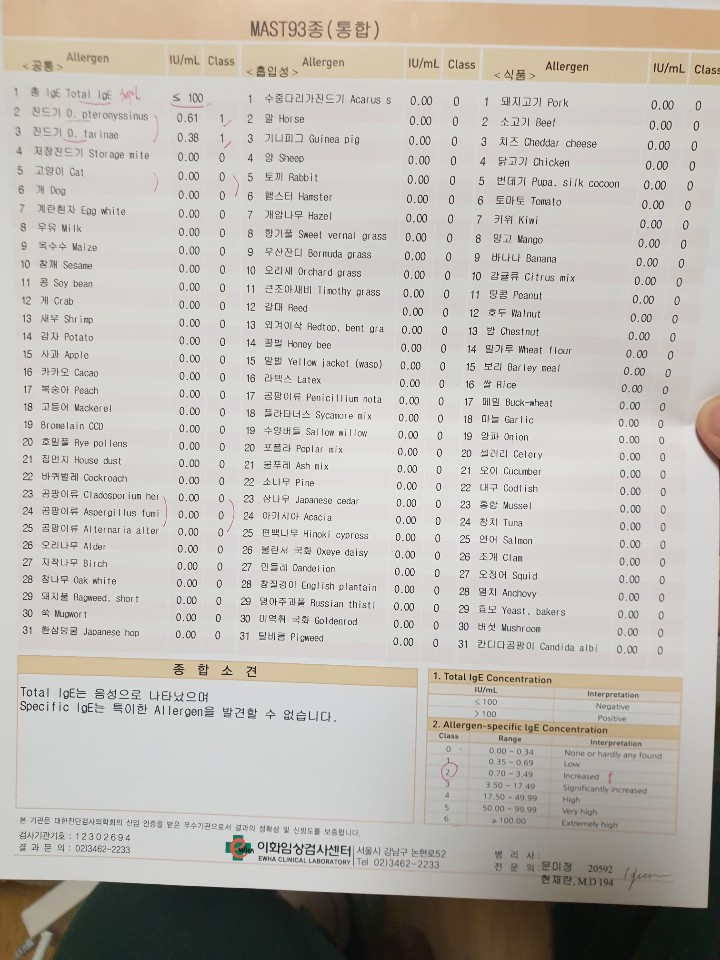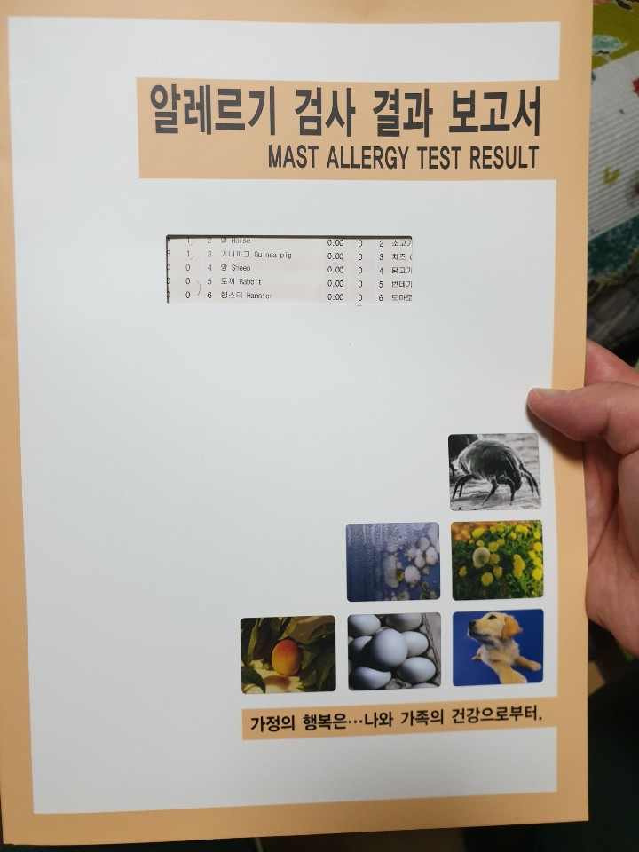 검사결과 표지입니다. 섬뜩해보이는 진드기가 눈에 띄네요. 그리고 꽃가루와 강아지가 보입니다. 대표적인 알레르기 유발 물질이라서 그런것 같네요.