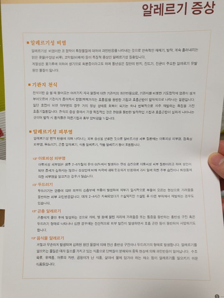 알레르기가 있을 경우 알레르기성 비염, 기관지 천식, 알레르기성 피부염등을 일으킬 수 있고 상세한 내용은 사진에 적혀있습니다.