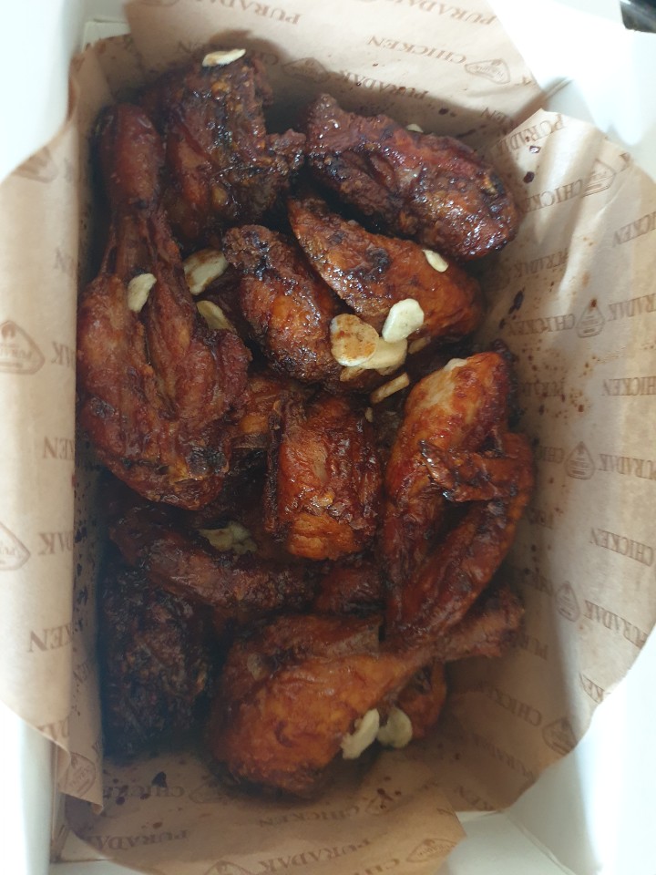 푸라닭 치킨이 신기한 것은 오븐에서 먼저 전처리를 하고 튀긴다는 것입니다. 그래서 구운치킨처럼 육즙을 가지고 있으면서 프라이드 치킨처럼 바삭함을 가지고 있습니다. 정말 여기저기서 좋은 것을 다 집어넣은듯한 느낌이네요. 마늘후레이크도 듬성듬성하게 뿌려놓았습니다. 간장치킨보다 훨씬더 검은 치킨입니다. 잘못보면 완전히 탄듯한 느낌이네요. 짜장면 색깔이라고 하면 이해할것입니다.