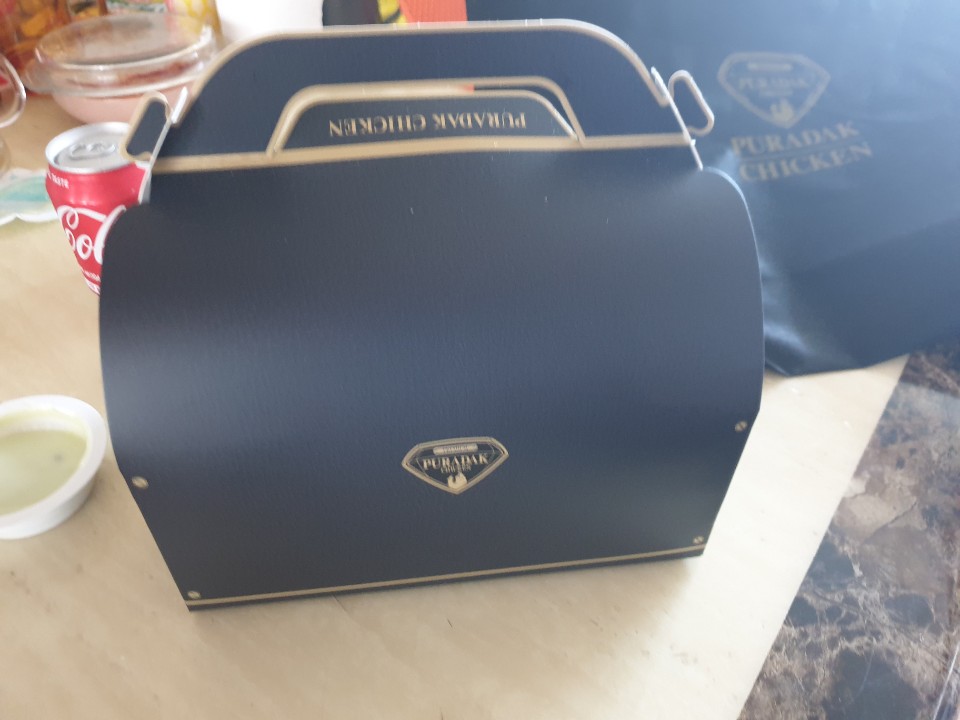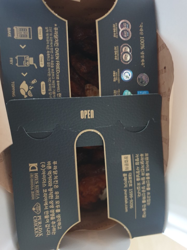 실내화가방같은 포장속에 마치 프라다 백처럼 생긴 상자를 넣어놓아습니다. 정말 명품을 받은 듣한 느낌을 받게 되네요. 예전에 포장지가 마케팅에서 얼마나 중요한 지를 실험한 기사를 읽은 적이 있습니다. 대상은 마가린이였는데 그때도 이 푸라닭 치킨이 사용한 고급화 전략을 사용하였습니다. 마가린의 싸구려 이미지를 지우기 위해서 겉 포장을 금색으로 포장지로 바꾸자 소비자들의 인식이 개선되었고 매출또한 50%이상 상승하였다고 합니다. 이처럼 치킨을 서민이 먹는 싼 음식이 아니라 대접받는 기분을 느끼게 해준다는 것이 놀랍습니다. 이제 맛뿐만아니라 소비자들을 사로잡기위해서는 다양한 마케팅 전략이 필요한 시대에 살고 있는것 같습니다.