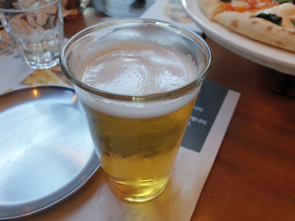 같이 주문한 생맥주 입니다. 카스였던걸로 기억합니다. 맥주는 치킨이라는 생각을 하는데 피자에도 굉장히 잘어울립니다.