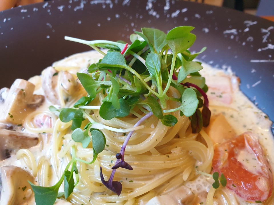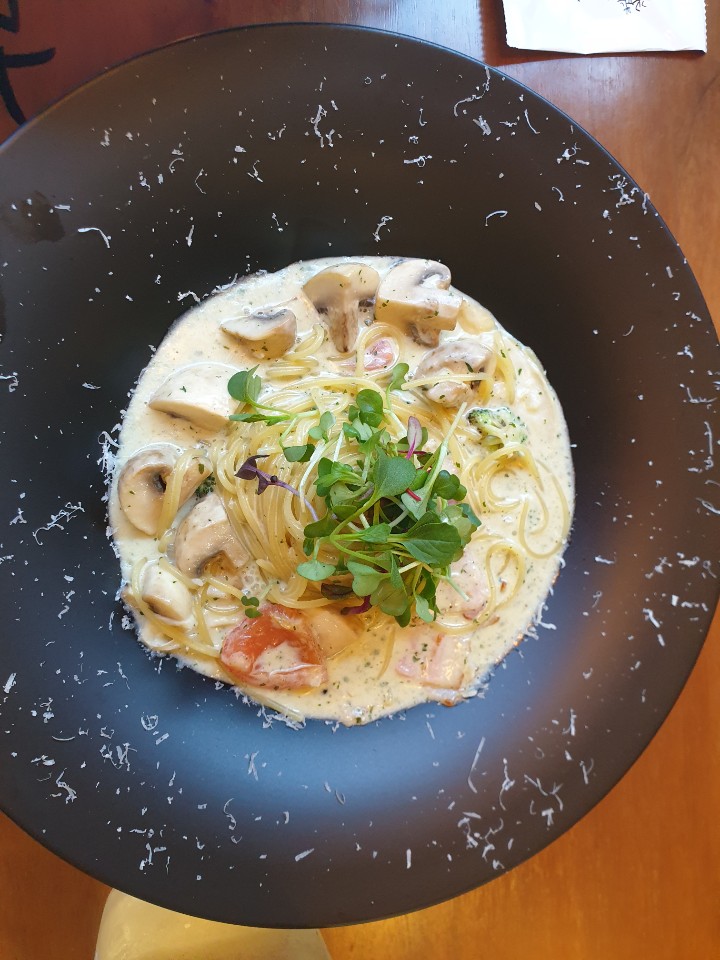 같이 주문한 양송이 크림스파게티입니다. 그렇게 뛰어난 맛은 아니지만, 평타는 치는 맛입니다. 버섯을 좋아하기 때문에 양송이가 품질이 좋아서 마음에 들었습니다. 또한 특이하게 크림소스에 토마토를 넣었는데 의외로 맛있었습니다.