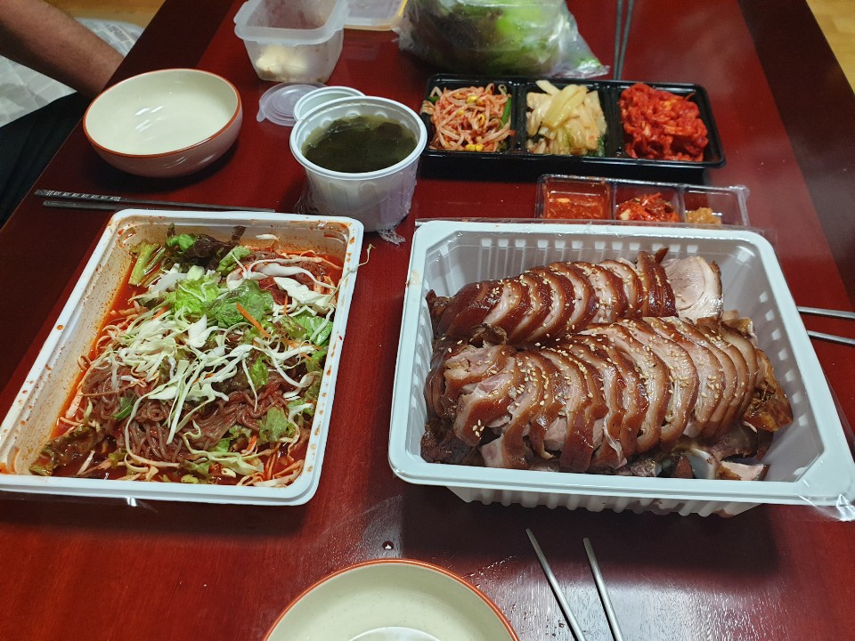 쟁반국수와 족발, 미역국, 소스(새우젓, 굴젓, 된장), 김치류(백김치, 콩나물무침, 무말랭이), 상추와 깻잎, 마늘과 고추가 나옵니다. 요즘 족발집도 경쟁이 심해져서 서로 하나라도 더 줄려고 노력하는 것 같습니다. 한 5~6년 정도 족발을 시키면 쟁반국수를 주지 않아서 섭섭했던 기간이 있었는데 이제는 모든 업체들이 다 주는 것 같습니다. 참 다행입니다.